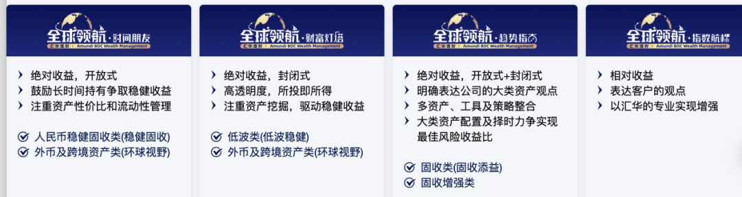 来到汇华理财后,王茜梳理了公司的业务和产品,推出“全球领航”产品品牌体系,包含4个子系列:时间朋友、财富灯塔、趋势指南、指数航标,其中的前三个子系列产品以绝对收益为投资目标。