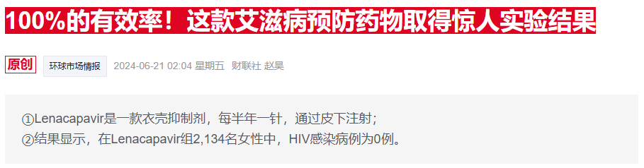 财联社文章曾多次介绍过来那卡帕韦。试验数据显示,在3期PURPOSE 1和PURPOSE 2研究中,接受药物治疗的参与者中极高比率(其中一次为100%)保持HIV阴性状态。