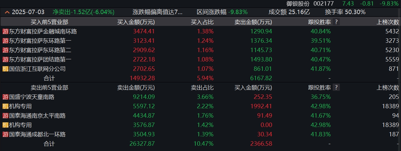 龙虎榜数据显示,7月3日,御银股份买入榜前五合计买入1.49亿元,卖出榜前五合计卖出2.63亿元。具体来看,买一至买四席位均为“拉萨天团”,合计买入金额为1.22亿元,卖方前五席位包括国盛宁波天童南路、国泰海通南京太平南路、国泰海通成都北一环路,以及两家机构专用席位 。