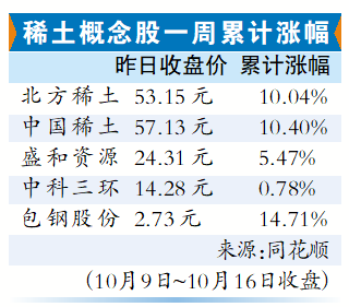 受政策调控及国际动态多重因素驱动,本周稀土板块表现亮眼。截至10月16日收盘,北方稀土、中科三环、盛和资源股价虽有所回落,但得益于此前涨幅,前三季净利润增幅均达100%以上。