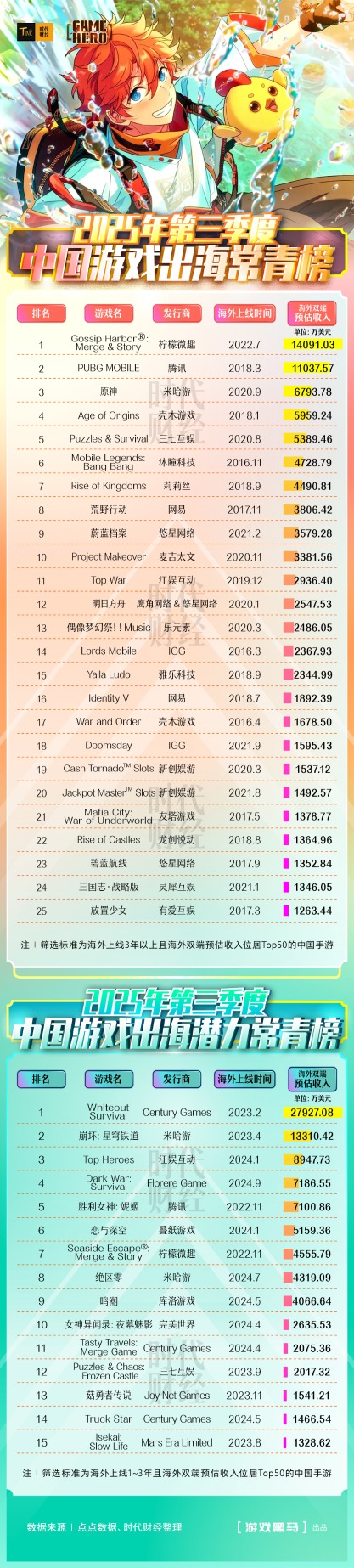 时代财经以海外上线3年以上且海外双端预估收入跻身Top50的中国手游为筛选标准,统计并发布《2025年第三季度中国游戏出海常青榜》(下称“《出海常青榜》”);同...