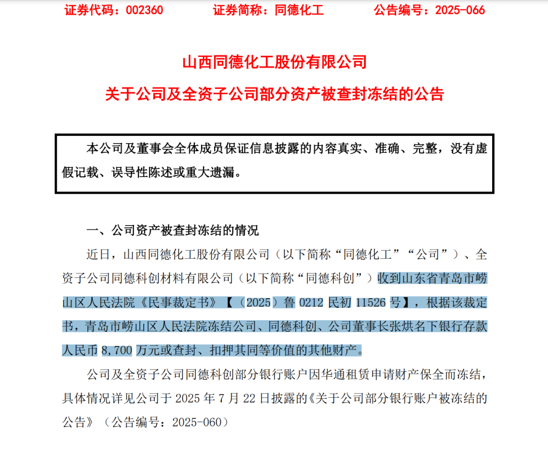 8月1日晚间,山西省民爆龙头企业同德化工(证券代码:002360)发布公告称,公司及全资子公司同德科创近日收到青岛市崂山区人民法院《民事裁定书》。根据该裁定书,青岛市崂山区人民法院冻结公司、同德科创、公司董事长张烘名下银行存款8700万元或查封、扣押其同等价值的其他财产。