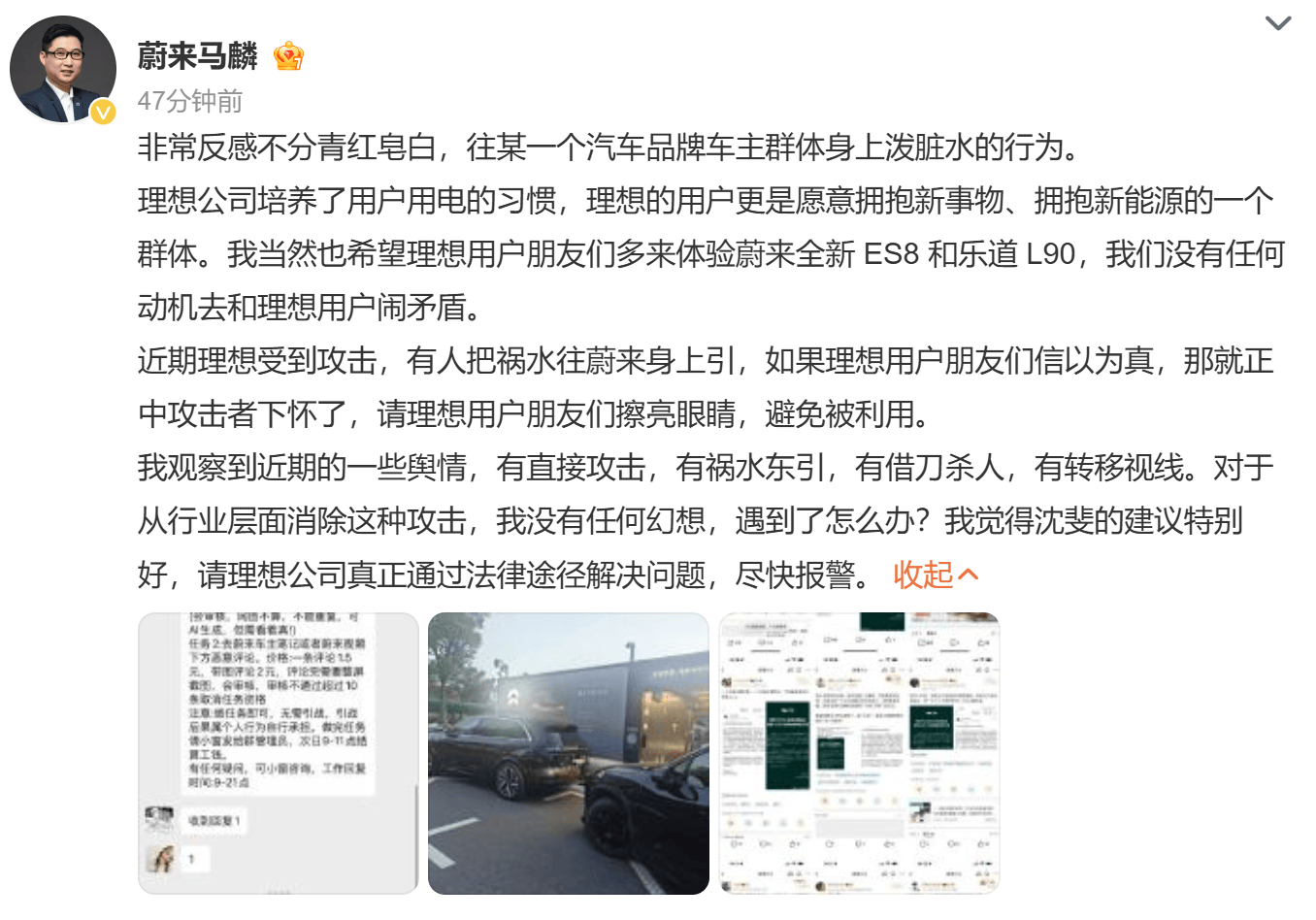 据马麟发文截图显示,有网友在提及理想近期舆论事件时也提到了蔚来。马麟希望理想用户不要信以为真。同时,他支持理想公司通过法律途径解决问题,建议尽快报警。