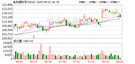 周四(8月21日)美股早盘,吉利德科学股价一度跌超3.5%,最低报每股114.56美元,为8月8日以来的最低水平。
