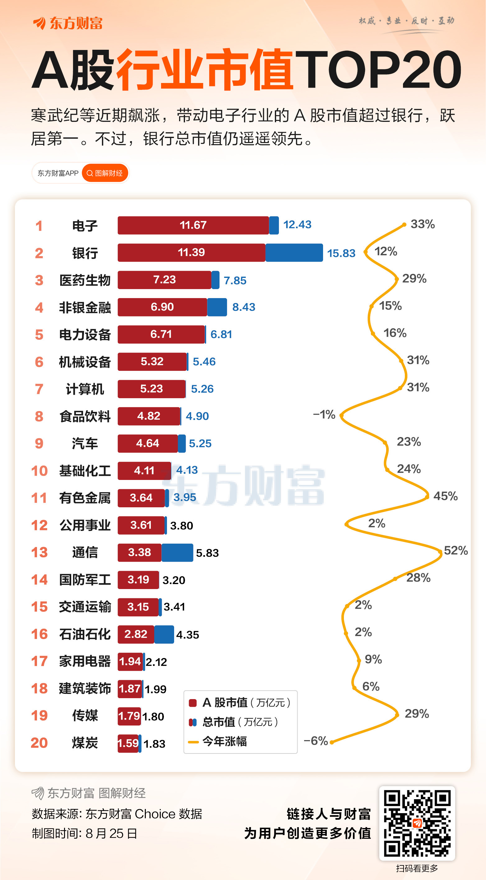 8月25日,电子行业涨超2%,板块A股市值报11.67万亿元,在31个申万一级行业中居首,第二名银行的A股市值为11.39万亿元。