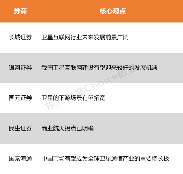 长城证券认为,受国家政策、技术进步和市场需求等因素驱动,卫星互联网行业正处于高速发展期,未来发展前景广阔,持续看好该行业投资机会。银河证券指出,政策支持力度加大,牌照发放的促进以及生态构建持续推动的产业发展趋势下,我国卫星互联网建设有望迎来较好的发展机遇。
