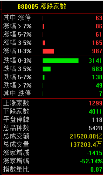 全市场共1299只个股上涨,63只个股涨停,4011只个股下跌。