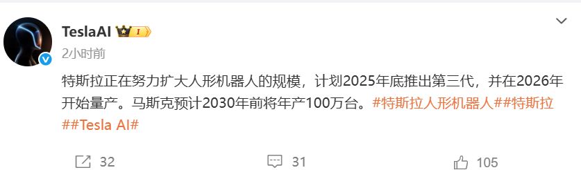 9月30日下午,特斯拉通过官微宣布,特斯拉正在努力扩大人形机器人的规模,计划2025年底推出第三代,并在2026年开始量产。