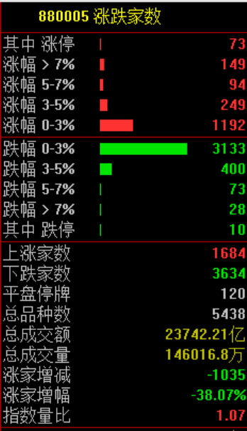 市场共1684只个股上涨,73只个股涨停,3634只个股下跌。