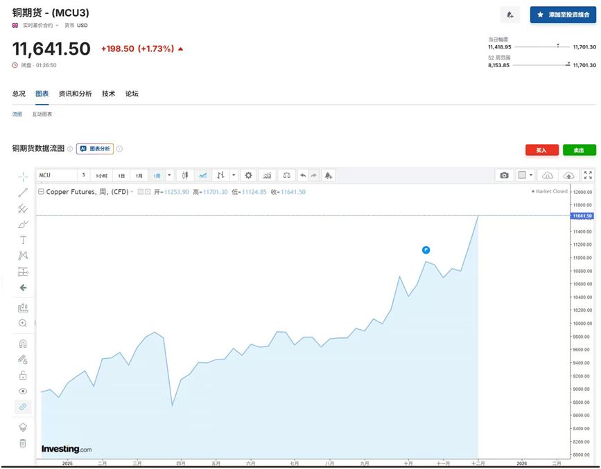 12月4日,伦敦金属交易所(LME)铜价一举冲破11500美元/吨关口,创下历史新高。12月5日,伦敦铜价报11641.5美元/吨再创新高,今年年内累计上涨32.77%。