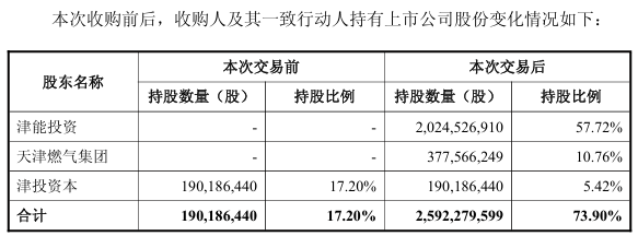 公告显示,本次收购前,津投资本为上市公司控股股东,天津市国资委为上市公司实际控制人。本次收购后,上市公司的控股股东将变更为津能投资,实际控制人未发生变更。