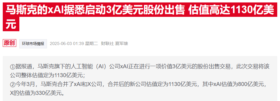 今年3月,马斯克将xAI与其社交媒体平台X合并,新实体估值高达1130亿美元。该集团近期启动了一项二级市场交易,允许员工将所持股份出售给外部投资者,以印证马斯克当时设定的估值水平。