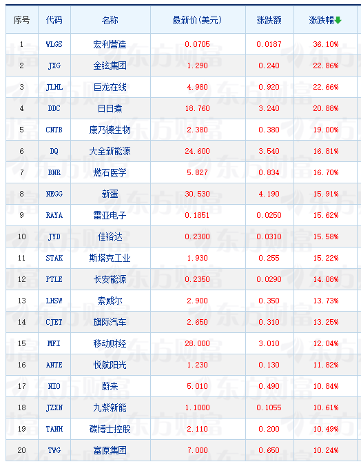 上涨股当中(按市值从高到低),阿里巴巴涨0.37%,拼多多涨3.03%,网易涨1.56%,京东涨1.44%,中华电信涨0.69%,腾讯音乐涨0.33%,理想汽车涨1.11%,百度涨4.10%,贝壳涨1.55%,富途控股涨2.48%,小鹏汽车涨3.48%,中通涨2.64%,蔚来涨10.84%,华住酒店集团涨2.15%,中国新城农村涨8.37%,BOSS直聘涨3.02%,唯品会涨3.17%,新东方涨1.84%,极氪涨0.83%,微牛涨16.07%,WSP控股涨2.57%,名创优品涨0.06%。