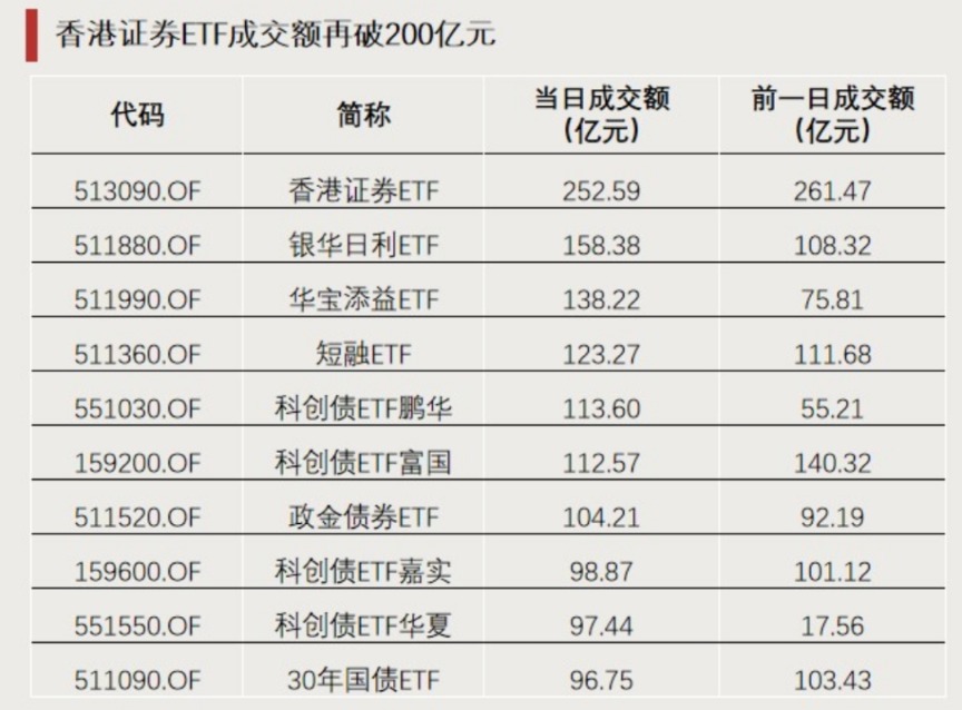 7月24日,截至收盘,ETF两市成交额3798.24亿元。具体来看,7月24日,香港证券ETF(513090)成交额达252.59亿元,位居全市场首位。这是继该ETF于7月23日成交额达261.47亿元后,成交额再度突破200亿元。